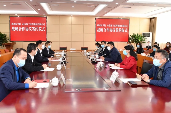 3月25日上午,潍坊医学院与山东海王医药集团有限公司战略合作协议签约仪式在浮烟山校区举行。山东海王医药集团有限公司总裁、山东海王银河医药有限公司总裁史晓明一行8人,潍坊医学院党委书记李明、院长管英俊、副院长刘军出席签约仪式。签约仪式由刘军主持。