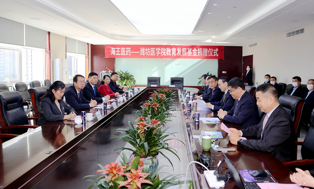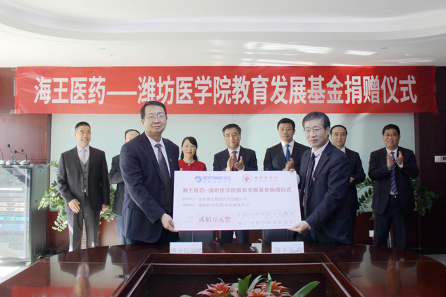 11月12日上午,潍坊医学院与山东海王医药集团有限公司教育发展基金捐赠仪式在山东海王医药集团有限公司举行。潍坊市人大常委会主任苏立科,学校党委书记李明,院长管英俊,副院长葛国文,潍坊市高新区党工委书记、管委会主任宋赤峰,山东海王医药集团有限公司董事长孔宪俊、总裁史晓明、副总裁田功和出席仪式。仪式由山东海王医药集团有限公司执行总裁谭新政主持。
